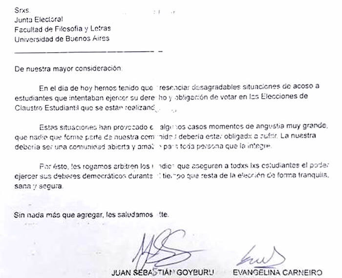 Desde el FEI Filosofía y Letras hemos decidido elevar ante la Junta Electoral de la Secretaría de Extensión y Bienestar Universitario un pedido de veda electoral, para proteger a los estudiantes de las múltiples situaciones de violencia, hostigamiento y acoso sexual que se han perpetrado durante la semana por parte de algunas agrupaciones partidarias que se suman a la contaminación física y visual en los pasillos de la facultad.