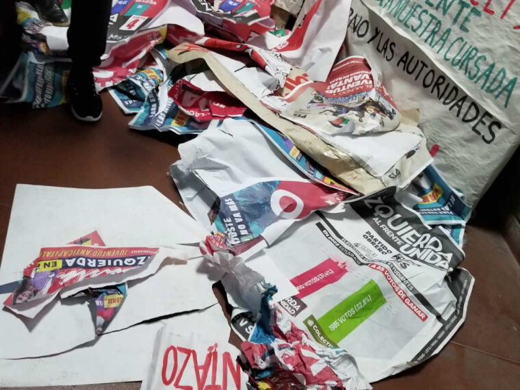 Por otro lado, con la enorme cantidad de carteles ubicados en lugares indebidos, les no docentes no pueden limpiar como corresponde y se ven obligades a no poder cumplir realmente con sus labores. Ni hablar de la mugre que queda en la facultad luego, porque las agrupaciones que colocan los carteles no se hacen cargo de quitarlos una vez terminada su campaña. Quienes cursaron el viernes por la noche son testigos de la cantidad de papeles que había en el piso y de que les militantes estaban presentes, pero tocando bombos y cantando a todo pulmón en lugar de ayudar a les no docentes a limpiar. Pareciera que es más importante hacerle cantitos a una agrupación rival en lugar de velar por el bienestar de la comunidad de Filo y sus espacios. Y lo peor es que quienes sí queremos ayudar tampoco somos libres de hacerlo. ¿Acaso ustedes se animan a correrle un cartel a una agrupación después de lo que ocurrió en 2022?