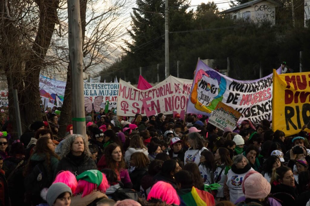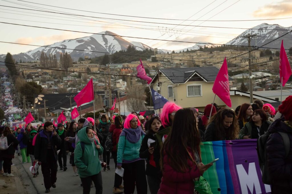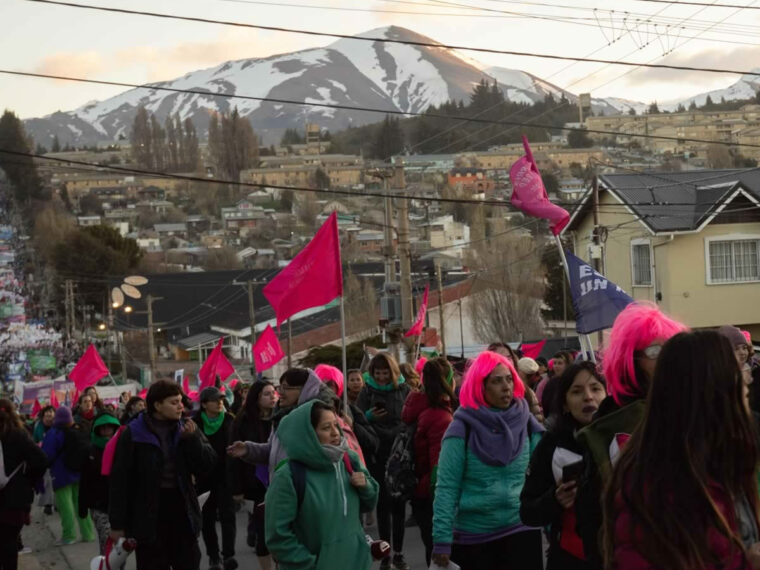 Las Socorristas en Red suelen marchar con pelucas rosas. La marcha se eleva sobre las calles onduladas de Bariloche (2023).